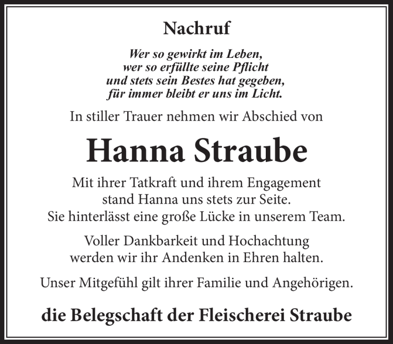 Hier finden Sie alle Traueranzeigen aus der Zeitung, die bisher für Hanna Straube erschienen sind. Weitere Traueranzeigen, die in der Zeitung erscheinen, werden hier ebenfalls aufgelistet