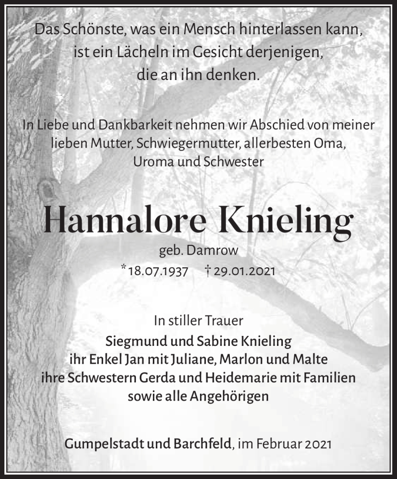 Hier finden Sie alle Traueranzeigen aus der Zeitung, die bisher für Hannalore Knieling erschienen sind. Weitere Traueranzeigen, die in der Zeitung erscheinen, werden hier ebenfalls aufgelistet
