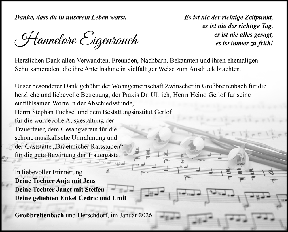 Hier finden Sie alle Traueranzeigen aus der Zeitung, die bisher für Hannelore Eigenrauch erschienen sind. Weitere Traueranzeigen, die in der Zeitung erscheinen, werden hier ebenfalls aufgelistet
