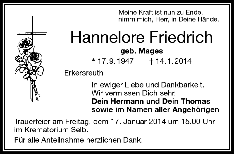 Hier finden Sie alle Traueranzeigen aus der Zeitung, die bisher für Hannelore Friedrich erschienen sind. Weitere Traueranzeigen, die in der Zeitung erscheinen, werden hier ebenfalls aufgelistet
