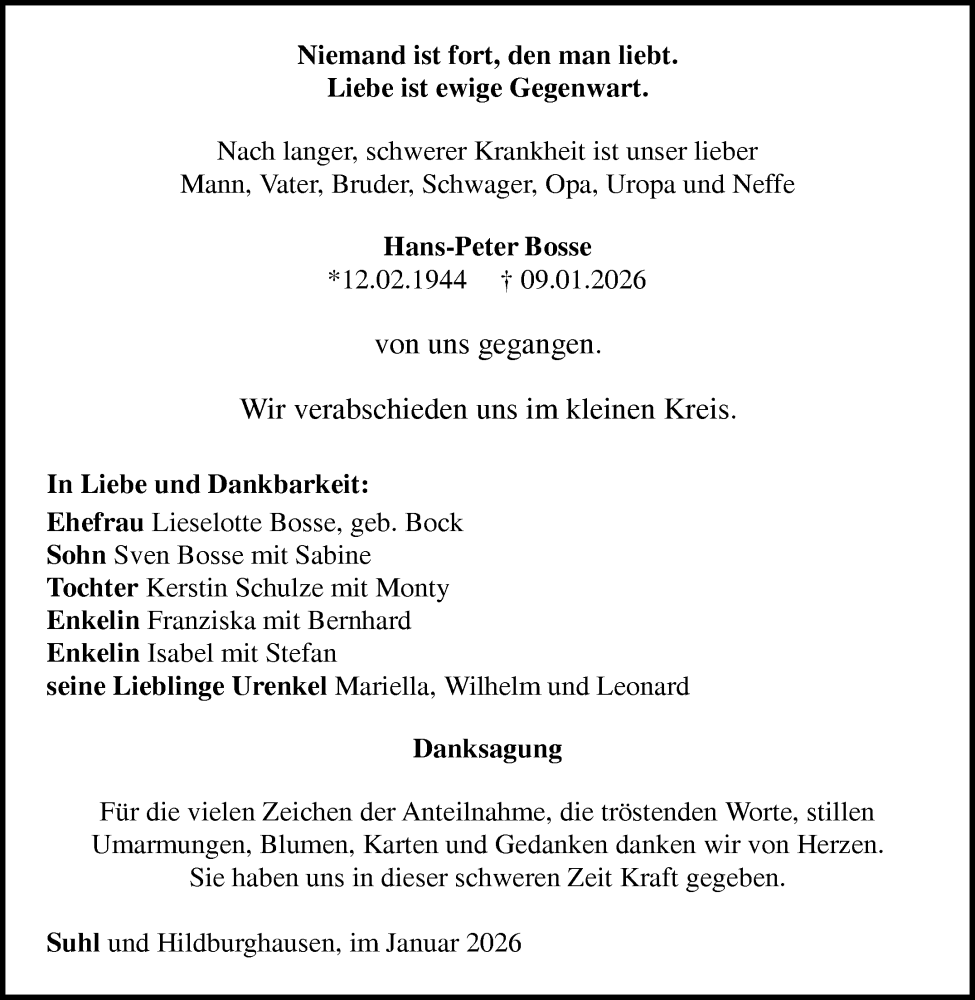Hier finden Sie alle Traueranzeigen aus der Zeitung, die bisher für Hans-Peter Bosse erschienen sind. Weitere Traueranzeigen, die in der Zeitung erscheinen, werden hier ebenfalls aufgelistet