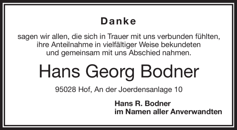 Hier finden Sie alle Traueranzeigen aus der Zeitung, die bisher für Hans Georg Bodner erschienen sind. Weitere Traueranzeigen, die in der Zeitung erscheinen, werden hier ebenfalls aufgelistet