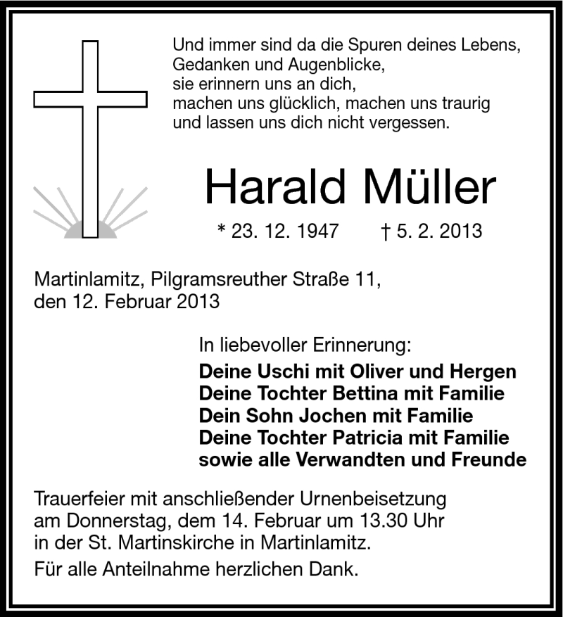 Hier finden Sie alle Traueranzeigen aus der Zeitung, die bisher für Harald Müller erschienen sind. Weitere Traueranzeigen, die in der Zeitung erscheinen, werden hier ebenfalls aufgelistet