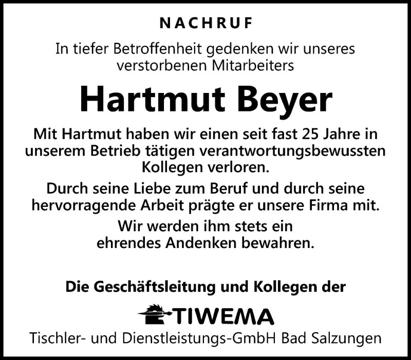 Hier finden Sie alle Traueranzeigen aus der Zeitung, die bisher für Hartmut Beyer erschienen sind. Weitere Traueranzeigen, die in der Zeitung erscheinen, werden hier ebenfalls aufgelistet