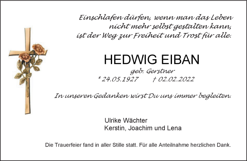 Hier finden Sie alle Traueranzeigen aus der Zeitung, die bisher für Hedwig Eiban erschienen sind. Weitere Traueranzeigen, die in der Zeitung erscheinen, werden hier ebenfalls aufgelistet