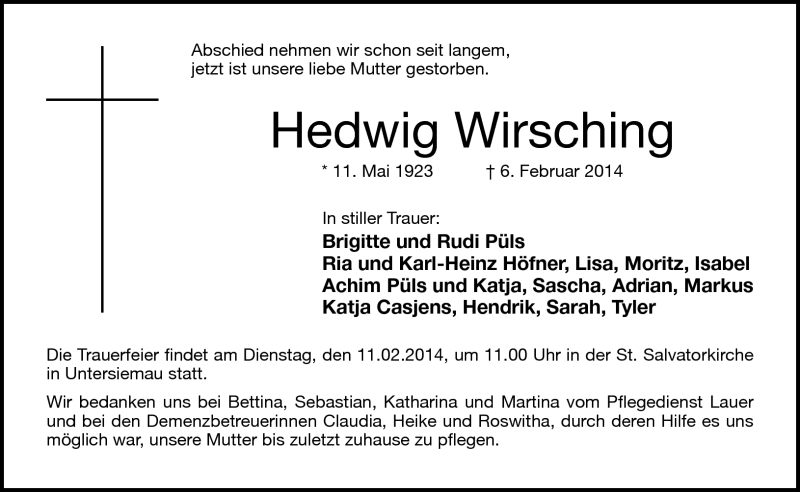 Hier finden Sie alle Traueranzeigen aus der Zeitung, die bisher für Hedwig Wirsching erschienen sind. Weitere Traueranzeigen, die in der Zeitung erscheinen, werden hier ebenfalls aufgelistet