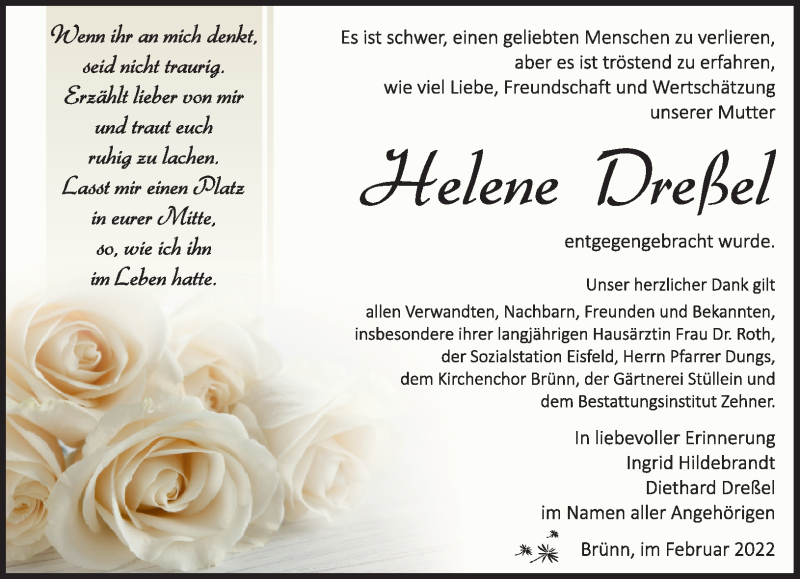 Hier finden Sie alle Traueranzeigen aus der Zeitung, die bisher für Helene Dreßel erschienen sind. Weitere Traueranzeigen, die in der Zeitung erscheinen, werden hier ebenfalls aufgelistet