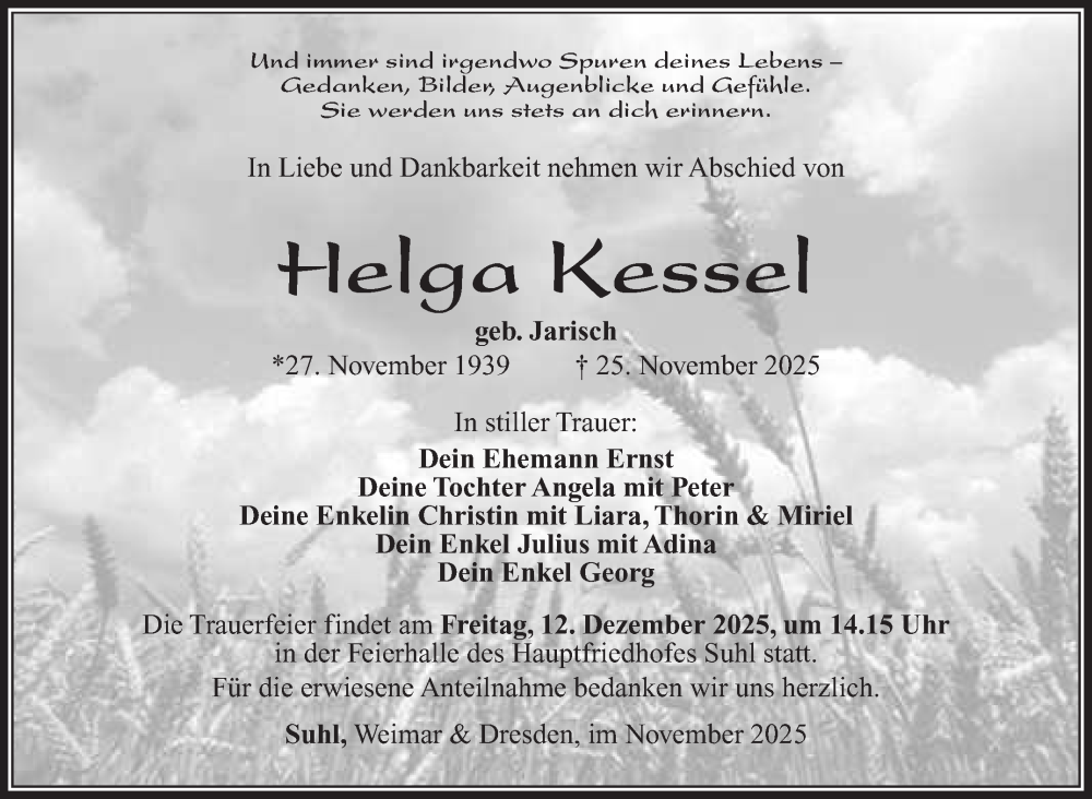 Hier finden Sie alle Traueranzeigen aus der Zeitung, die bisher für Helga Kessel erschienen sind. Weitere Traueranzeigen, die in der Zeitung erscheinen, werden hier ebenfalls aufgelistet
