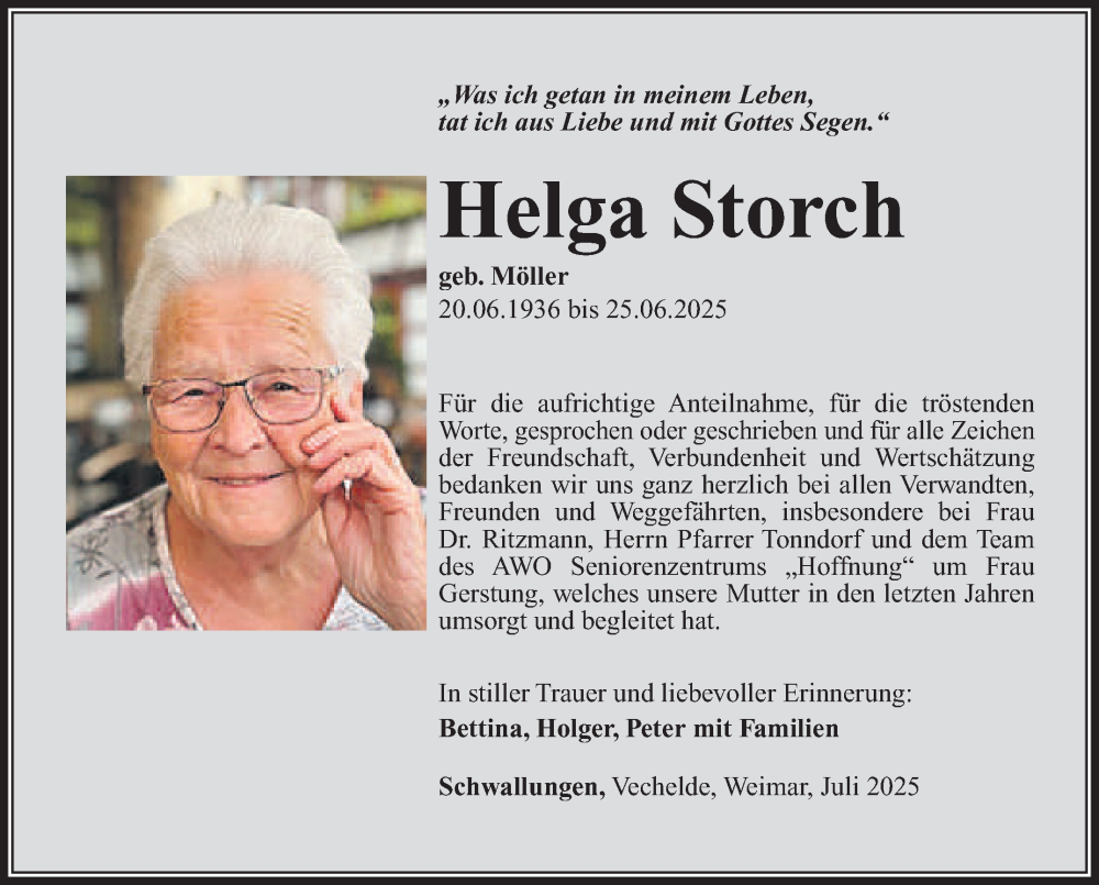 Hier finden Sie alle Traueranzeigen aus der Zeitung, die bisher für Helga Storch erschienen sind. Weitere Traueranzeigen, die in der Zeitung erscheinen, werden hier ebenfalls aufgelistet