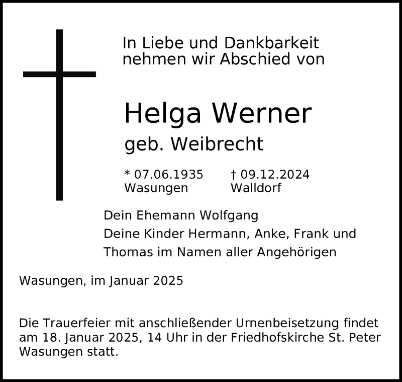 Hier finden Sie alle Traueranzeigen aus der Zeitung, die bisher für Helga Werner erschienen sind. Weitere Traueranzeigen, die in der Zeitung erscheinen, werden hier ebenfalls aufgelistet