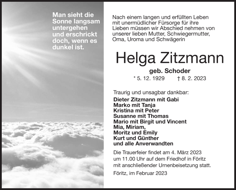 Hier finden Sie alle Traueranzeigen aus der Zeitung, die bisher für Helga Zitzmann erschienen sind. Weitere Traueranzeigen, die in der Zeitung erscheinen, werden hier ebenfalls aufgelistet