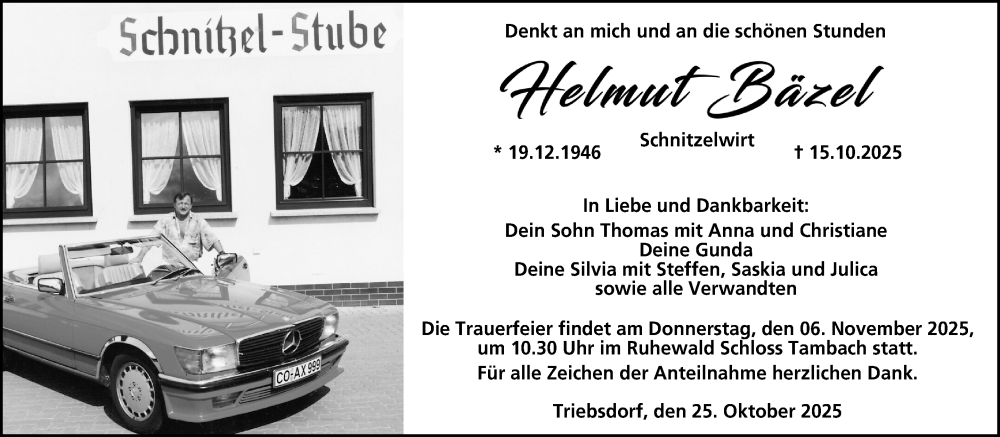 Hier finden Sie alle Traueranzeigen aus der Zeitung, die bisher für Helmut Bäzel erschienen sind. Weitere Traueranzeigen, die in der Zeitung erscheinen, werden hier ebenfalls aufgelistet