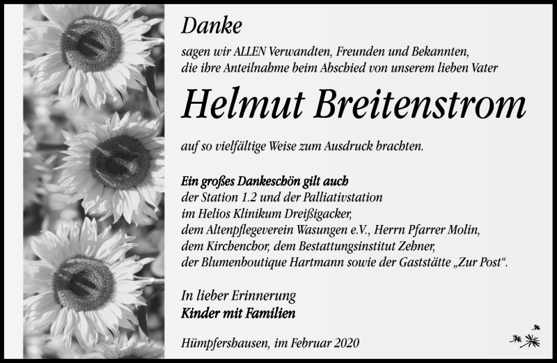 Hier finden Sie alle Traueranzeigen aus der Zeitung, die bisher für Helmut Breitenstrom erschienen sind. Weitere Traueranzeigen, die in der Zeitung erscheinen, werden hier ebenfalls aufgelistet
