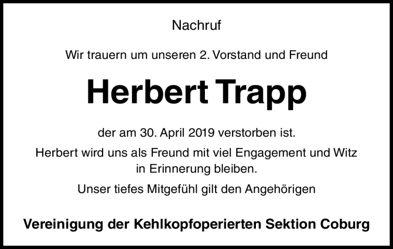 Hier finden Sie alle Traueranzeigen aus der Zeitung, die bisher für Herbert Trapp erschienen sind. Weitere Traueranzeigen, die in der Zeitung erscheinen, werden hier ebenfalls aufgelistet