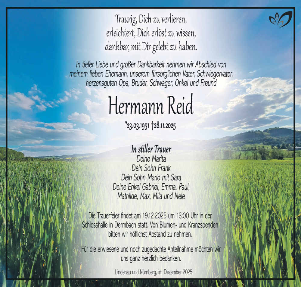Hier finden Sie alle Traueranzeigen aus der Zeitung, die bisher für Hermann Reid erschienen sind. Weitere Traueranzeigen, die in der Zeitung erscheinen, werden hier ebenfalls aufgelistet