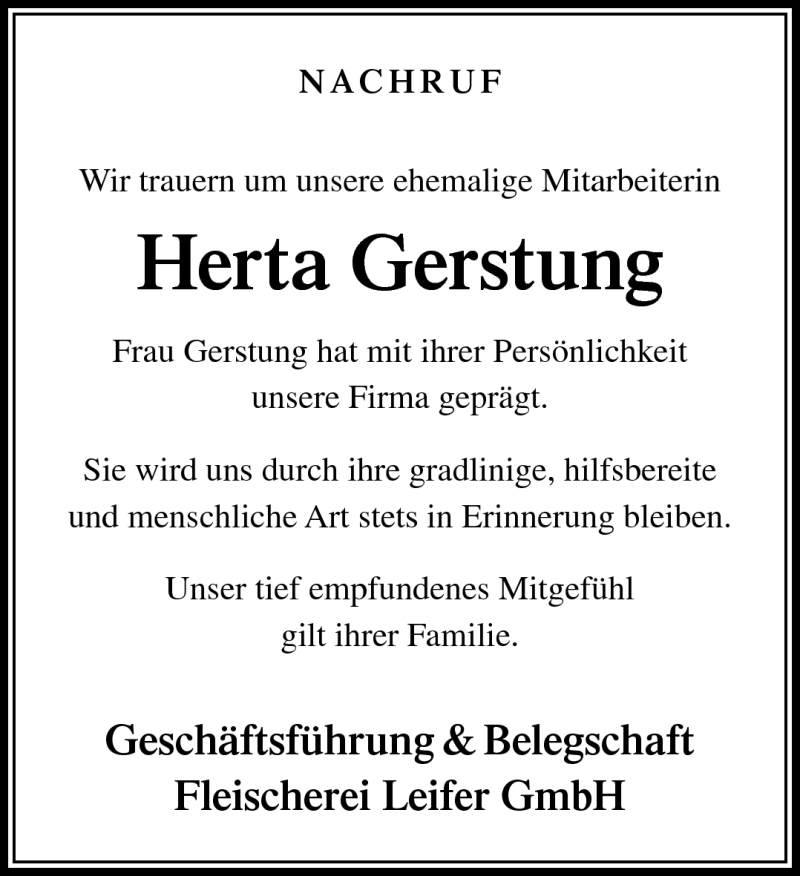 Hier finden Sie alle Traueranzeigen aus der Zeitung, die bisher für Herta Gerstung erschienen sind. Weitere Traueranzeigen, die in der Zeitung erscheinen, werden hier ebenfalls aufgelistet