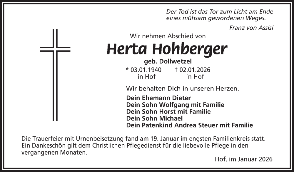 Hier finden Sie alle Traueranzeigen aus der Zeitung, die bisher für Herta Hohberger erschienen sind. Weitere Traueranzeigen, die in der Zeitung erscheinen, werden hier ebenfalls aufgelistet