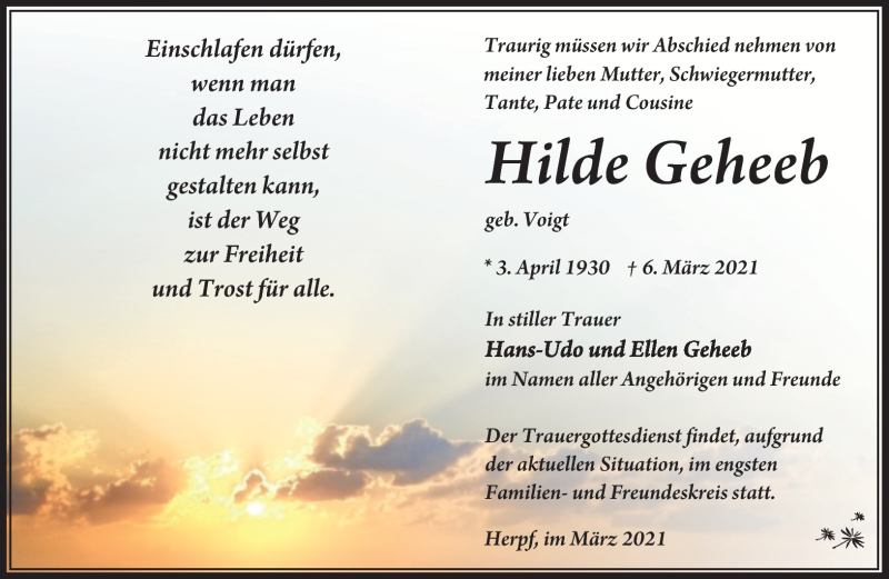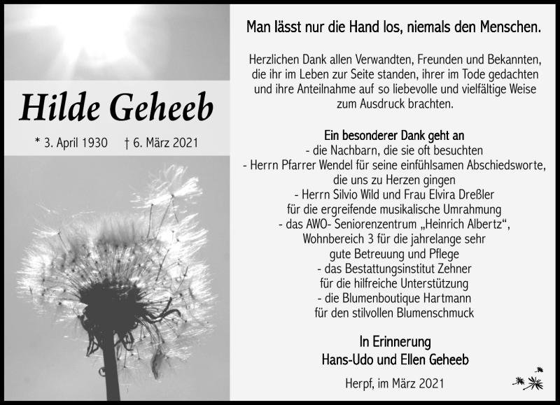 Hier finden Sie alle Traueranzeigen aus der Zeitung, die bisher für Hilde Geheeb erschienen sind. Weitere Traueranzeigen, die in der Zeitung erscheinen, werden hier ebenfalls aufgelistet