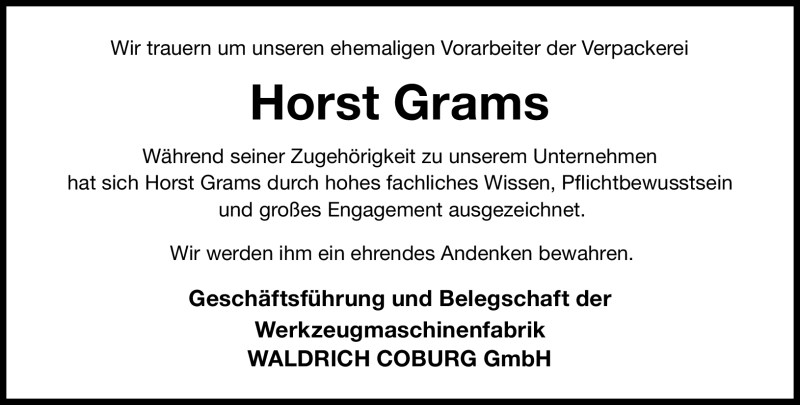 Hier finden Sie alle Traueranzeigen aus der Zeitung, die bisher für Horst Grams erschienen sind. Weitere Traueranzeigen, die in der Zeitung erscheinen, werden hier ebenfalls aufgelistet