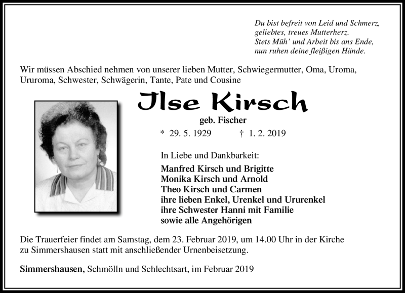Hier finden Sie alle Traueranzeigen aus der Zeitung, die bisher für Ilse Kirsch erschienen sind. Weitere Traueranzeigen, die in der Zeitung erscheinen, werden hier ebenfalls aufgelistet