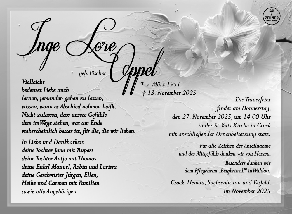 Hier finden Sie alle Traueranzeigen aus der Zeitung, die bisher für Inge Lore Oppel erschienen sind. Weitere Traueranzeigen, die in der Zeitung erscheinen, werden hier ebenfalls aufgelistet