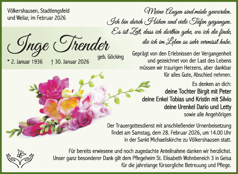 Hier finden Sie alle Traueranzeigen aus der Zeitung, die bisher für Inge Trender erschienen sind. Weitere Traueranzeigen, die in der Zeitung erscheinen, werden hier ebenfalls aufgelistet