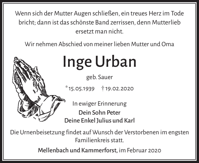 Hier finden Sie alle Traueranzeigen aus der Zeitung, die bisher für Inge Urban erschienen sind. Weitere Traueranzeigen, die in der Zeitung erscheinen, werden hier ebenfalls aufgelistet