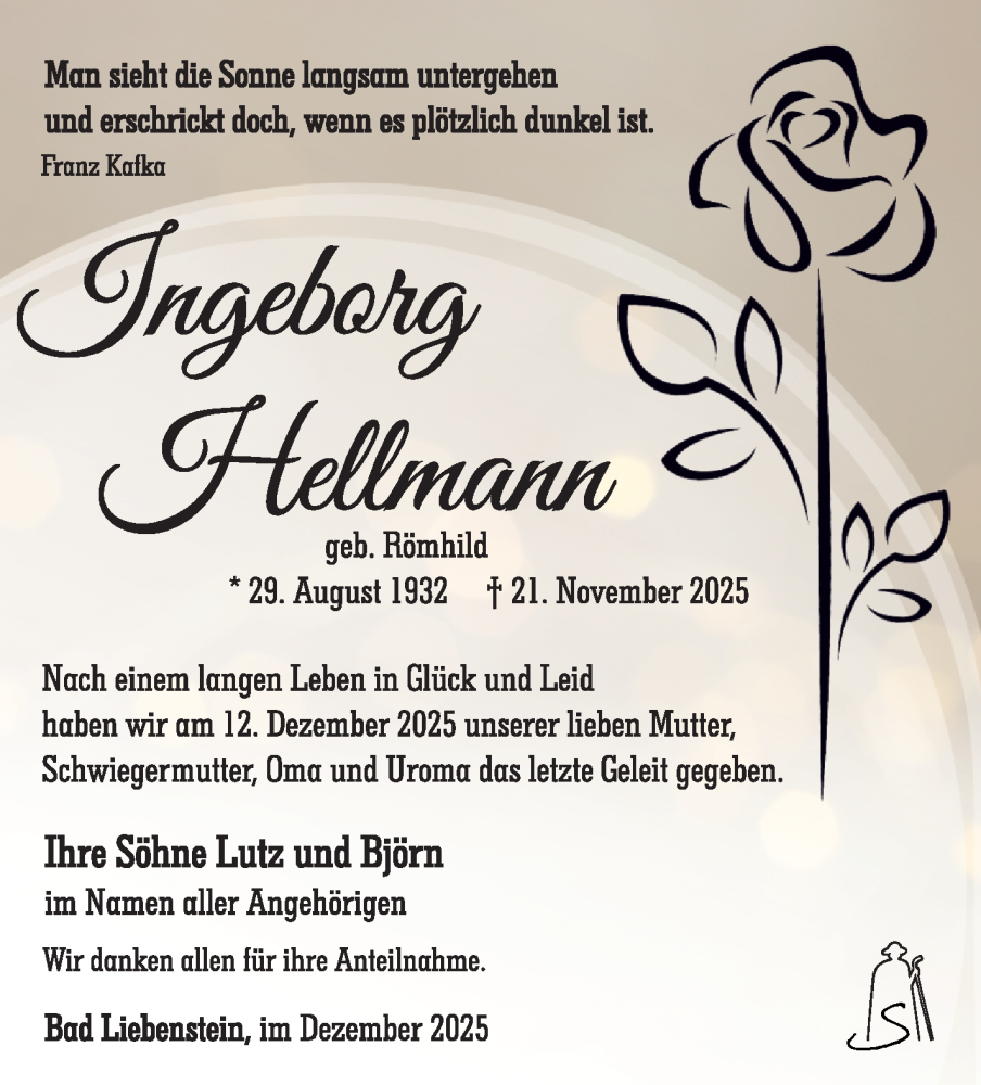 Hier finden Sie alle Traueranzeigen aus der Zeitung, die bisher für Ingeborg Hellmann erschienen sind. Weitere Traueranzeigen, die in der Zeitung erscheinen, werden hier ebenfalls aufgelistet