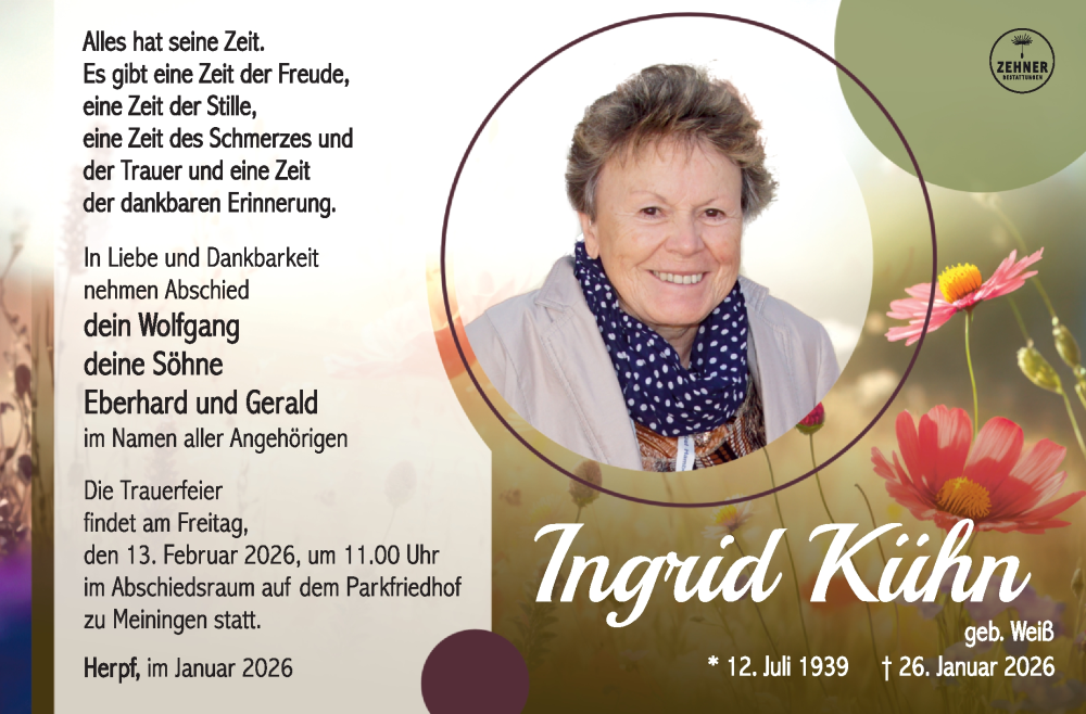 Hier finden Sie alle Traueranzeigen aus der Zeitung, die bisher für Ingrid Kühn erschienen sind. Weitere Traueranzeigen, die in der Zeitung erscheinen, werden hier ebenfalls aufgelistet