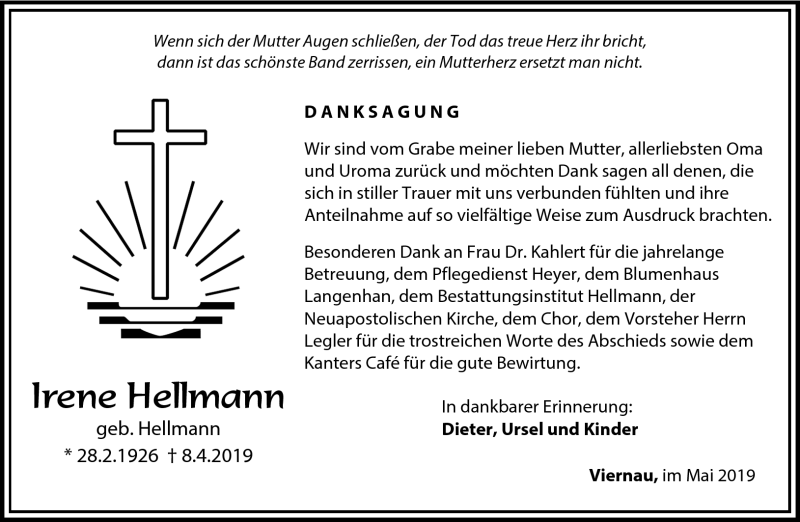 Hier finden Sie alle Traueranzeigen aus der Zeitung, die bisher für Irene Hellmann erschienen sind. Weitere Traueranzeigen, die in der Zeitung erscheinen, werden hier ebenfalls aufgelistet