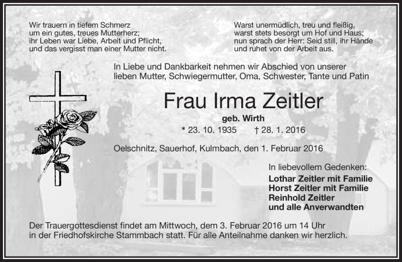 Hier finden Sie alle Traueranzeigen aus der Zeitung, die bisher für Irma Zeitler erschienen sind. Weitere Traueranzeigen, die in der Zeitung erscheinen, werden hier ebenfalls aufgelistet