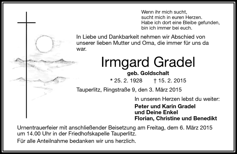 Hier finden Sie alle Traueranzeigen aus der Zeitung, die bisher für Irmgard Gradel erschienen sind. Weitere Traueranzeigen, die in der Zeitung erscheinen, werden hier ebenfalls aufgelistet