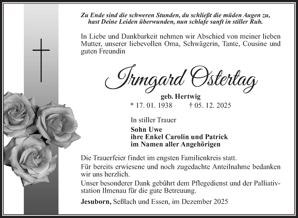 Hier finden Sie alle Traueranzeigen aus der Zeitung, die bisher für Irmgard Ostertag erschienen sind. Weitere Traueranzeigen, die in der Zeitung erscheinen, werden hier ebenfalls aufgelistet
