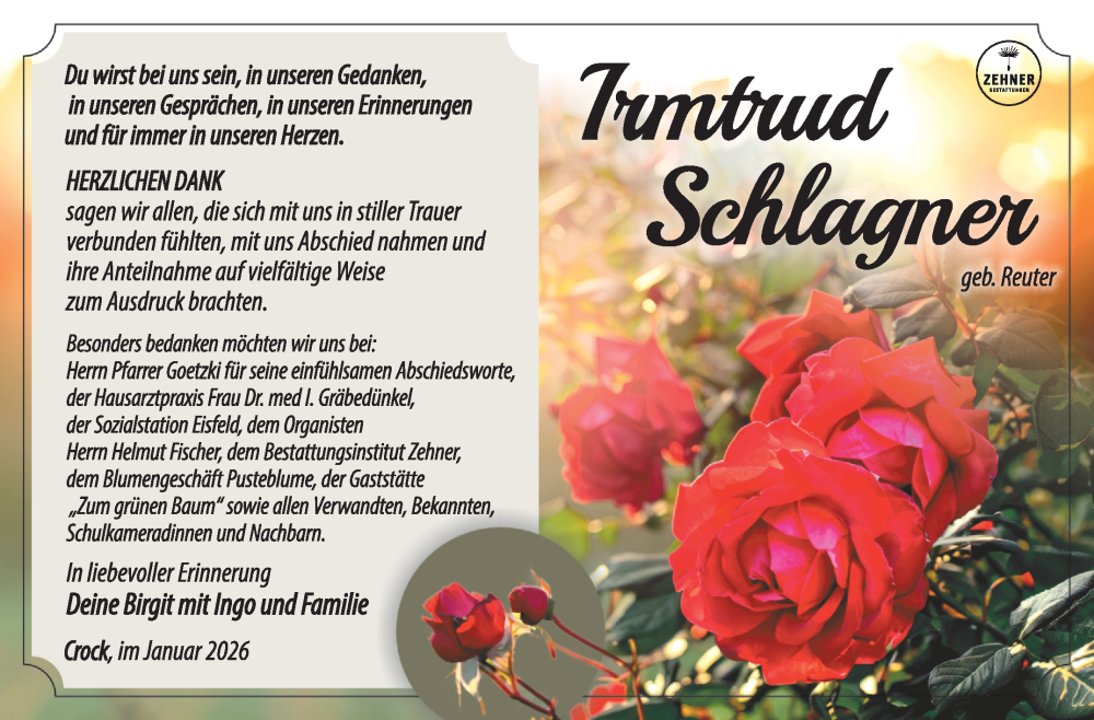 Hier finden Sie alle Traueranzeigen aus der Zeitung, die bisher für Irmtrud Schlagner erschienen sind. Weitere Traueranzeigen, die in der Zeitung erscheinen, werden hier ebenfalls aufgelistet