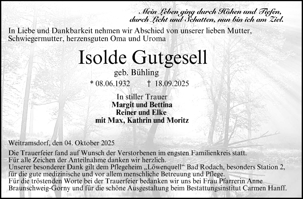 Hier finden Sie alle Traueranzeigen aus der Zeitung, die bisher für Isolde Gutgesell erschienen sind. Weitere Traueranzeigen, die in der Zeitung erscheinen, werden hier ebenfalls aufgelistet