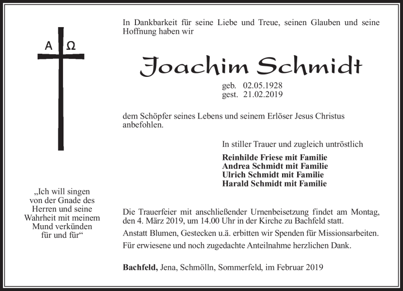 Hier finden Sie alle Traueranzeigen aus der Zeitung, die bisher für Joachim Schmidt erschienen sind. Weitere Traueranzeigen, die in der Zeitung erscheinen, werden hier ebenfalls aufgelistet