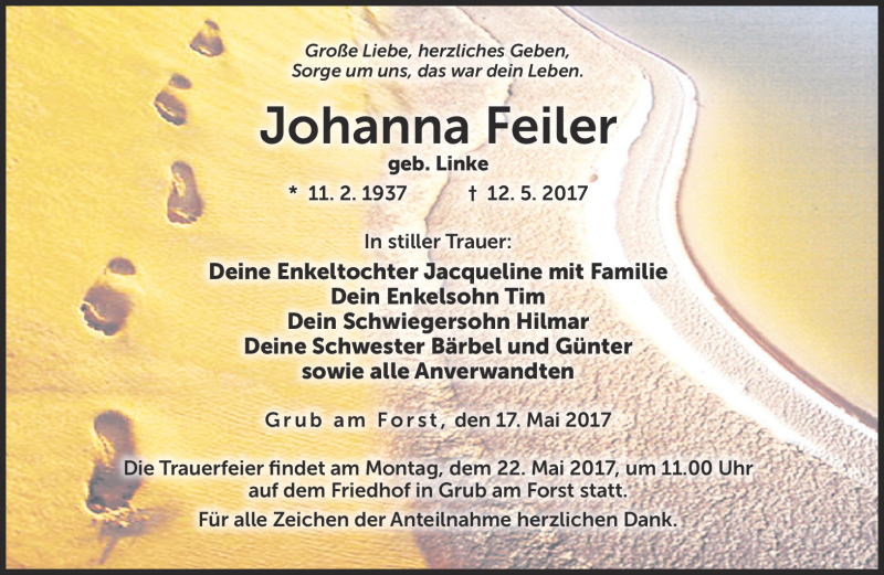 Hier finden Sie alle Traueranzeigen aus der Zeitung, die bisher für Johanna Feiler erschienen sind. Weitere Traueranzeigen, die in der Zeitung erscheinen, werden hier ebenfalls aufgelistet