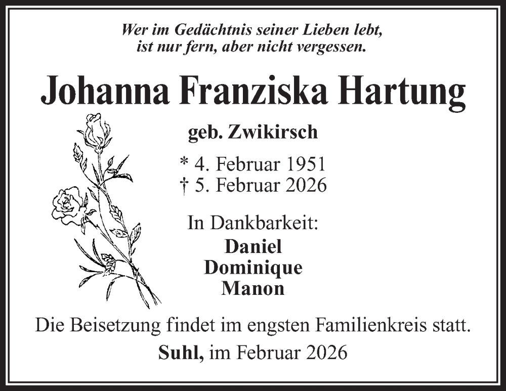 Hier finden Sie alle Traueranzeigen aus der Zeitung, die bisher für Johanna Franziska Hartung erschienen sind. Weitere Traueranzeigen, die in der Zeitung erscheinen, werden hier ebenfalls aufgelistet