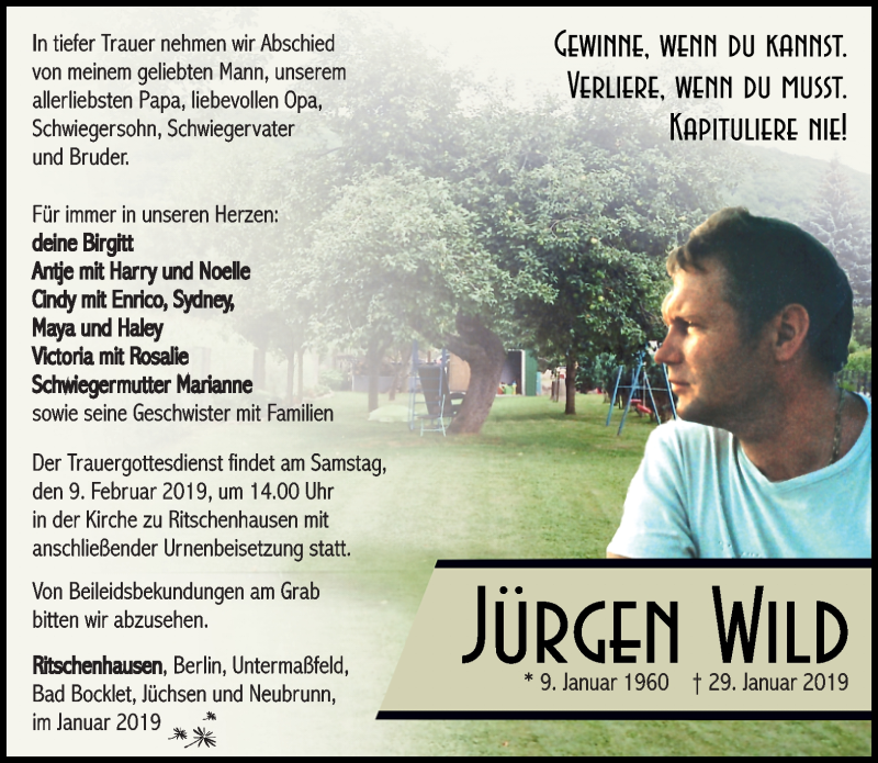 Hier finden Sie alle Traueranzeigen aus der Zeitung, die bisher für Jürgen Wild erschienen sind. Weitere Traueranzeigen, die in der Zeitung erscheinen, werden hier ebenfalls aufgelistet