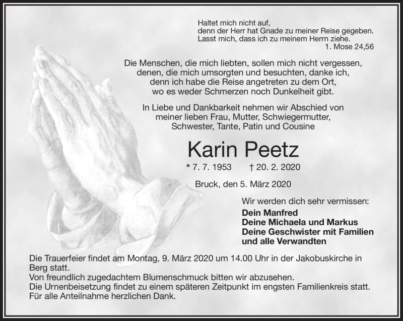 Hier finden Sie alle Traueranzeigen aus der Zeitung, die bisher für Karin Peetz erschienen sind. Weitere Traueranzeigen, die in der Zeitung erscheinen, werden hier ebenfalls aufgelistet