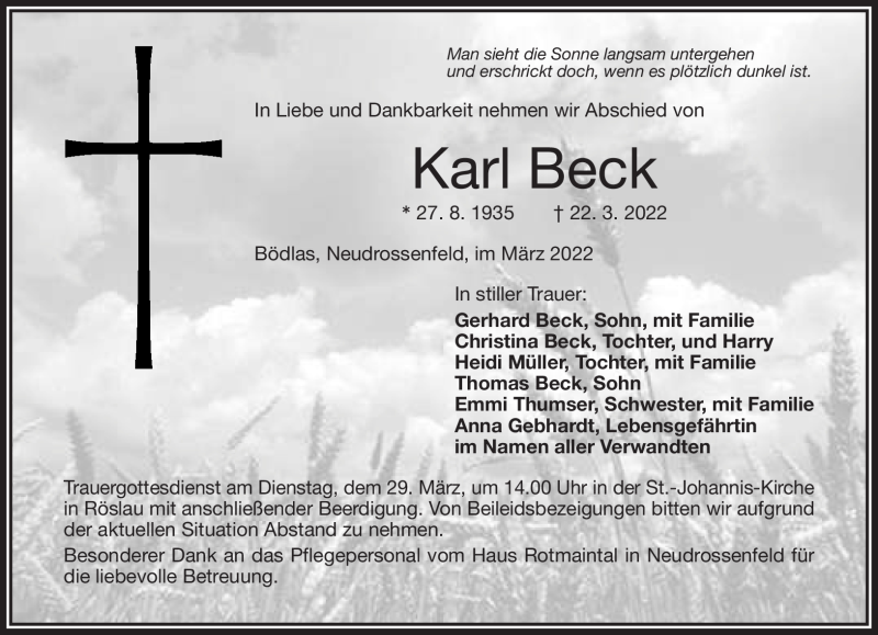 Hier finden Sie alle Traueranzeigen aus der Zeitung, die bisher für Karl Beck erschienen sind. Weitere Traueranzeigen, die in der Zeitung erscheinen, werden hier ebenfalls aufgelistet