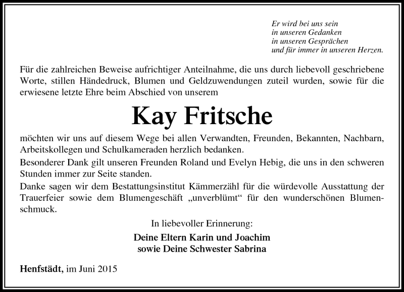Hier finden Sie alle Traueranzeigen aus der Zeitung, die bisher für Kay Fritsche erschienen sind. Weitere Traueranzeigen, die in der Zeitung erscheinen, werden hier ebenfalls aufgelistet