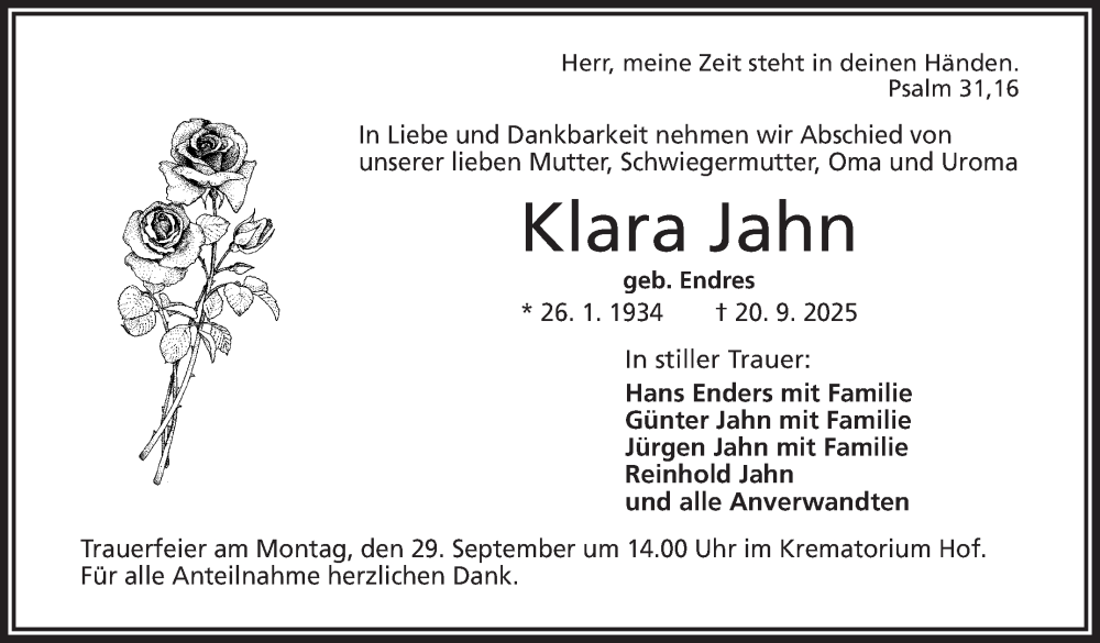 Hier finden Sie alle Traueranzeigen aus der Zeitung, die bisher für Klara Jahn erschienen sind. Weitere Traueranzeigen, die in der Zeitung erscheinen, werden hier ebenfalls aufgelistet