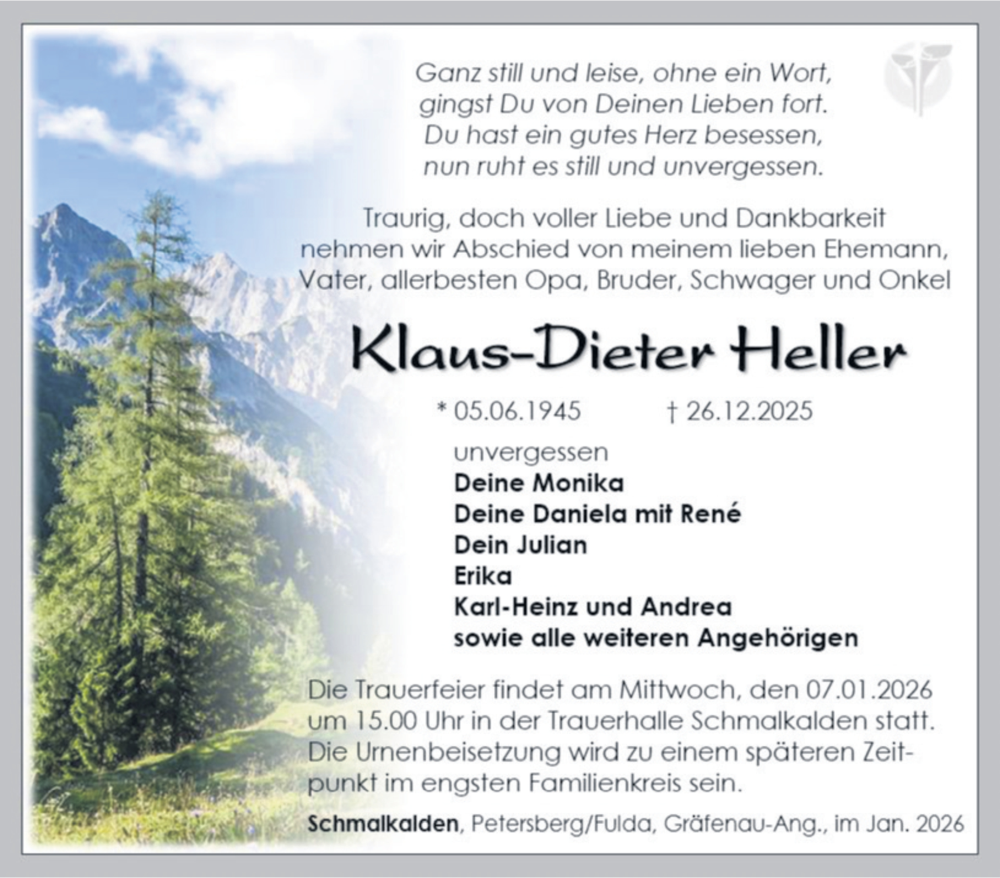 Hier finden Sie alle Traueranzeigen aus der Zeitung, die bisher für Klaus-Dieter Heller erschienen sind. Weitere Traueranzeigen, die in der Zeitung erscheinen, werden hier ebenfalls aufgelistet