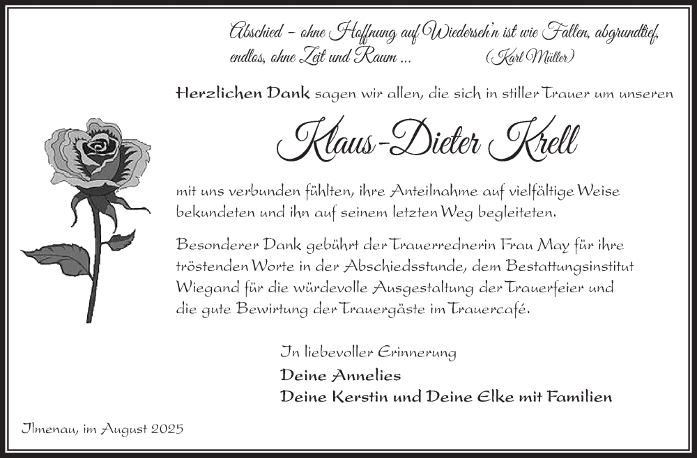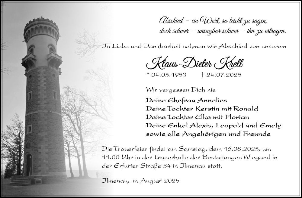Hier finden Sie alle Traueranzeigen aus der Zeitung, die bisher für Klaus-Dieter Krell erschienen sind. Weitere Traueranzeigen, die in der Zeitung erscheinen, werden hier ebenfalls aufgelistet
