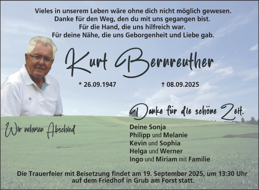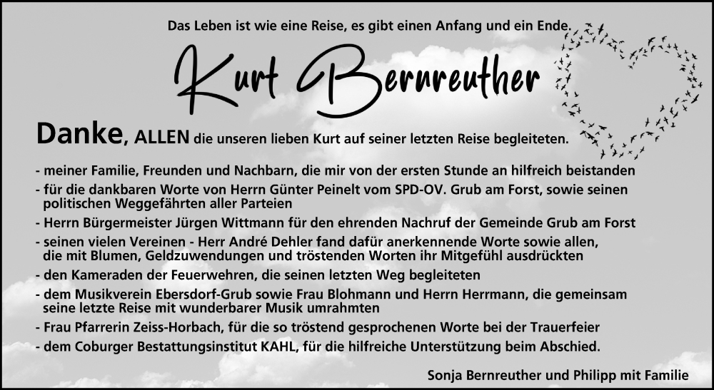 Hier finden Sie alle Traueranzeigen aus der Zeitung, die bisher für Kurt Bernreuther erschienen sind. Weitere Traueranzeigen, die in der Zeitung erscheinen, werden hier ebenfalls aufgelistet