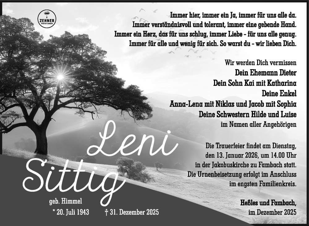 Hier finden Sie alle Traueranzeigen aus der Zeitung, die bisher für Leni Sittig erschienen sind. Weitere Traueranzeigen, die in der Zeitung erscheinen, werden hier ebenfalls aufgelistet
