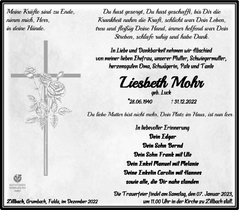 Hier finden Sie alle Traueranzeigen aus der Zeitung, die bisher für Liesbeth Mohr erschienen sind. Weitere Traueranzeigen, die in der Zeitung erscheinen, werden hier ebenfalls aufgelistet