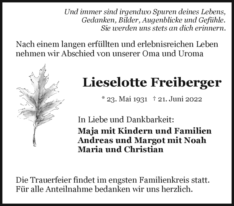 Hier finden Sie alle Traueranzeigen aus der Zeitung, die bisher für Lieselotte Freiberger erschienen sind. Weitere Traueranzeigen, die in der Zeitung erscheinen, werden hier ebenfalls aufgelistet