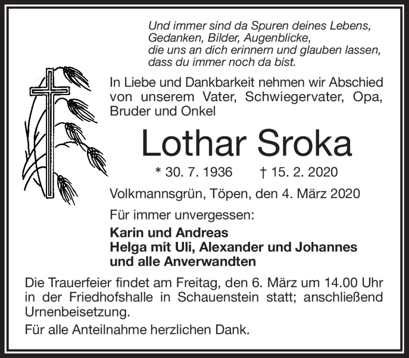 Hier finden Sie alle Traueranzeigen aus der Zeitung, die bisher für Lothar Sroka erschienen sind. Weitere Traueranzeigen, die in der Zeitung erscheinen, werden hier ebenfalls aufgelistet